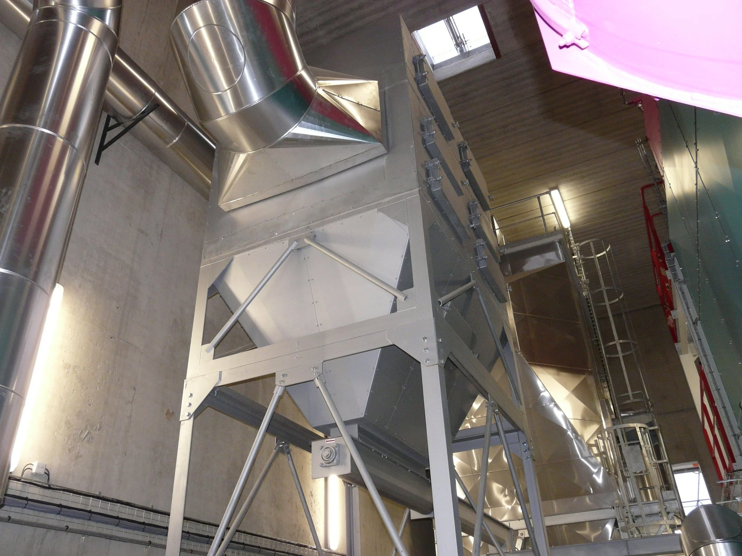 Géométrie spécifique du foyer pour limiter la hauteur de l’installation et permettre la mise en place dans un bâtiment existant